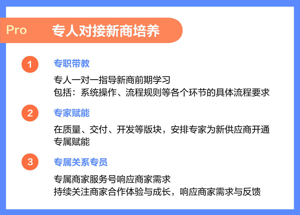 从前端开发到后端出货,再到销售分析,从生产优化到员工赋能,为商家提供差异化、全方位培育,更有专人专家在线咨询,定制化搭建培养机制,全方位关注新商成长,助力商家提升竞争力!更高的关注度,更多的资源支持,更全面的赋能机制!