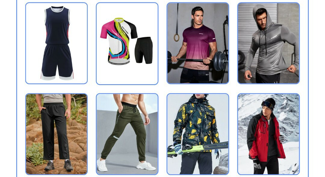运动健身服、运动卫衣、梭织裤、运动夹克、运动裤、球竞服、骑行服等