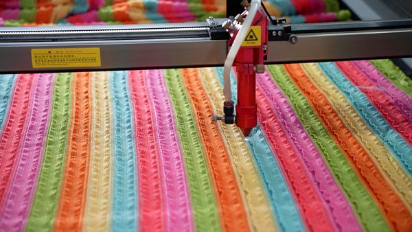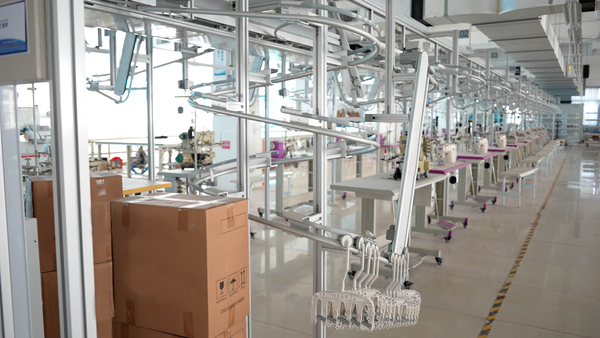 考虑公司管理、产能等因素,Ken还引进自动化裁床、吊挂生产等数字设备。“裁剪后的布料进入自动化吊挂生产,从头流到尾就是一件成衣,这比人工生产效率快一倍,帮助应对旺季的生产压力。”