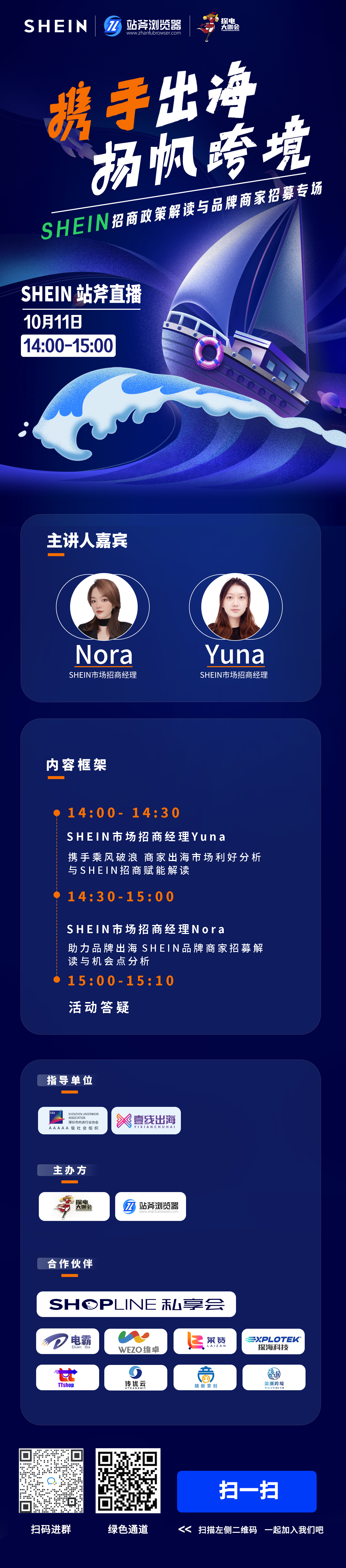 SHEIN招商直播|携手出海,扬帆跨境!SHEIN招商政策解读与品牌商家招募专场招商资讯发布时间:2023年12月07日 19:43:11资讯动态/SHEIN招商直播|携手出海,扬帆跨境!SHEIN招商政策解读与品牌商家招募专场SHEIN招商直播|携手出海,扬帆跨境!SHEIN招商政策解读与品牌商家招募专场招商资讯发布时间:2023年12月07日 19:43:11